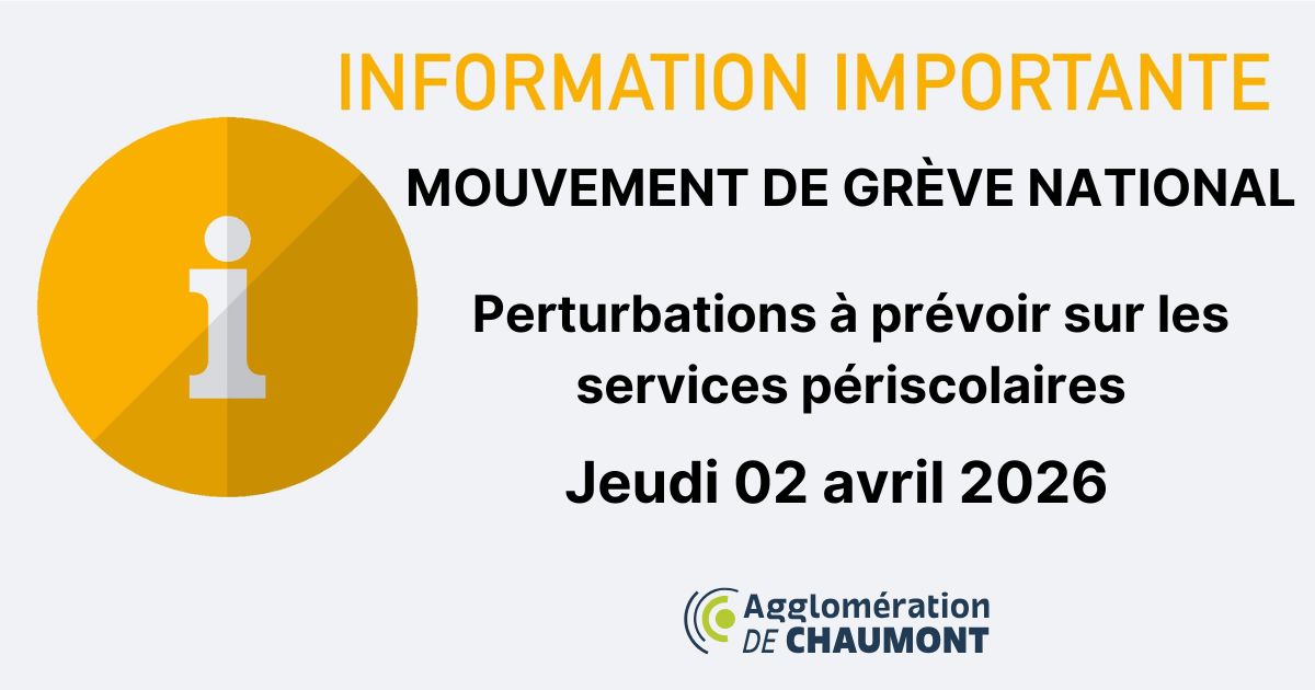 Suite à un mouvement de grève national, des perturbations sont à prévoir sur les services périscolaires de l’Agglomération de Chaumont jeudi 02 avril 2026.